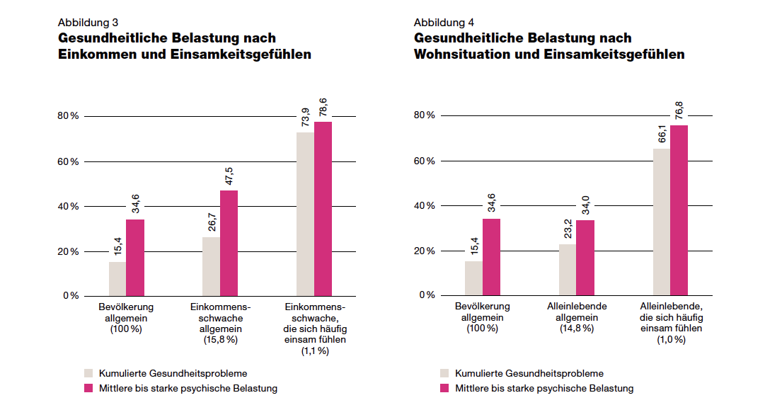 Diese im Bericht gesondert untersuchten Bevölkerungsgruppen, ie sich teilweise auch überschneiden, weisen nicht nur einen relativ geringen Grad an soziale Integration auf, sondern haben auch vermehrt Einsamkeitsgefühle und überdurchschnittlich häufig gesundheitliche Probleme.