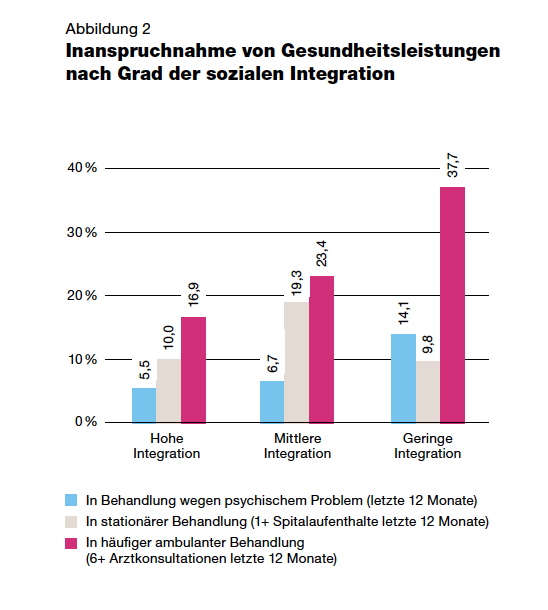 Eine mögliche Erklärung für diese unterschiedlichen Befunde ist, dass stationäre Behandlungen infolge von akuten medizinischen Notfällen oder schweren Erkrankungen naheliegenderweise weniger mit dem „sozialen“ Wohlbefinden oder mit allfälligen Beziehungsproblemen, Einsamkeitsgefühlen usw. zusammenhängen – ganz im Unterschied zu häufigen Arztbesuchen oder psychiatrischen bzw. psychotherapeutischen Behandlungen.
