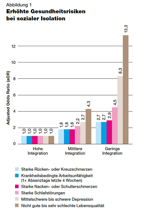 Eine mangelnde soziale Integration geht wie erwähnt und wenig überraschend mit einer Häufung von Einsamkeitsgefühlen einher, was sich wiederum ungünstig auf die Gesundheit und das Gesundheitsverhalten auswirkt. So nimmt beispielsweise der Konsum von psychotropen, stimmungsaufhellenden Medikamenten stark zu mit steigender Häufigkeit von Einsamkeitsgefühlen. Überhaupt scheinen sich gesundheitliche Risiken und Nachteile zu kumulieren, wenn Risikomerkmale kombiniert auftreten; wenn sich also etwa bei Einkommensschwachen und wenig Gebildeten zusätzlich zu ihrer sozialen Benachteiligung auch noch eine gewisse soziale Isolation oder häufige Einsamkeitsgefühle gesellen.