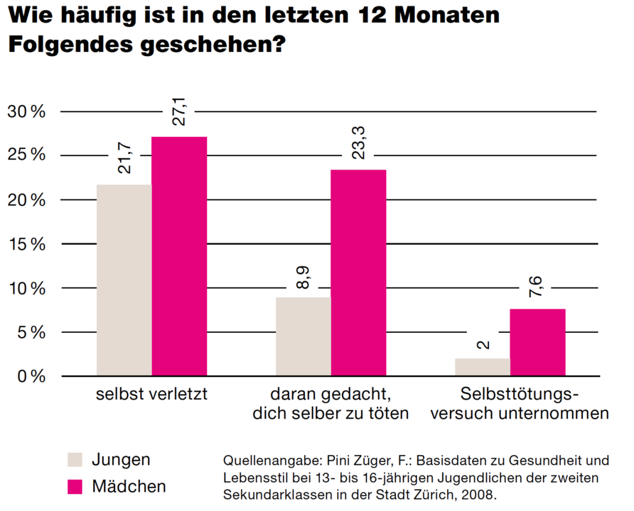 Jugendliche neigen in Krisen zu Selbstverletzungen, suizidalen Gedanken und suizidalem Verhalten. Dass solche Krisen bei Teenagern häufig sind, belegen auch die Zahlen einer Schülerbefragung aus dem Jahr 2007 / 2008. Bei dieser wurden Sekundarschulklassen in der Stadt Zürich befragt. Dabei hat sich gezeigt, dass sich über 20 % der Befragten mindestens ein Mal im Leben selbst verletzt haben. Auch bei den Suizidgedanken sind die Zahlen hoch, lassen jedoch deutliche Unterschiede zwischen Mädchen und Jungen erkennen. Während 23 % der Mädchen in den letzten 12 Monaten daran gedacht haben, sich selber zu töten, sind es bei den Jungen knapp 9 % (vgl. Grafik unten). Die erhöhte Depressionsneigung der Mädchen beginnt mit dem Einsetzen der Pubertät. Sie ist folglich zumindest teilweise hormonell begründet. Auch sind Mädchen bei Problemen oft gefühlsbetonter und grüblerischer in ihren Bewältigungsstrategien als Jungen.