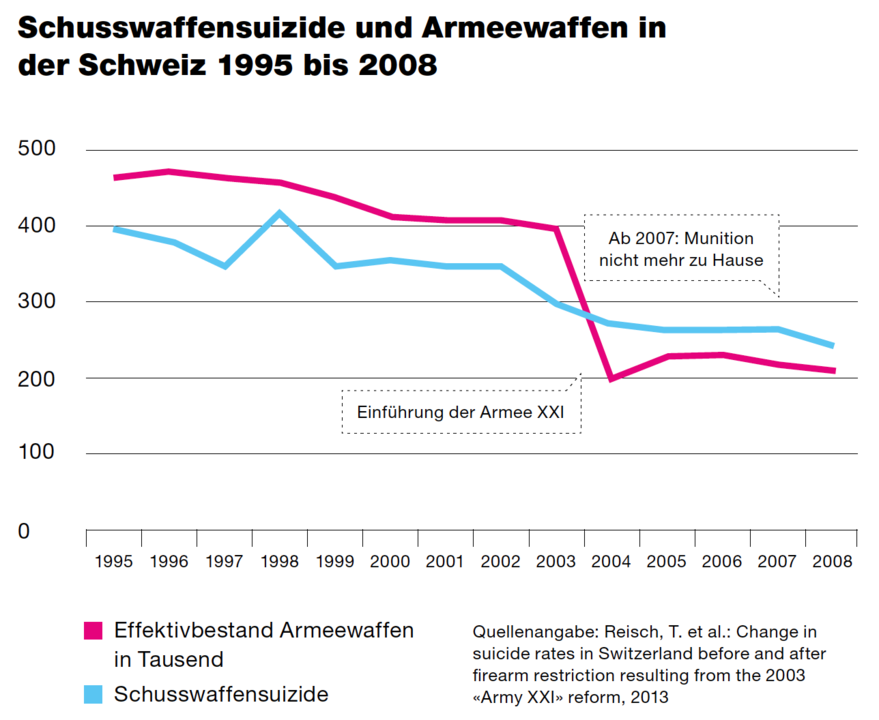Mit der Armeereform XXI wurde der Bestand an Armeewaffen massiv verkleinert. Als direkter Effekt davon ging die Anzahl der Schusswaffensuizide in der Schweiz deutlich zurück (siehe Tabelle unten). Gemäss einer Studie von Thomas Reisch et al. (2013) ging parallel dazu auch die Gesamtrate an Suiziden in der betroffenen Zielgruppe von Männern im Alter von 18-43 Jahren zurück. Besonders eindrücklich: In derselben Zeitperiode wurden Suizide nicht signifikant häufiger mit anderen Methoden begangen. Lediglich die Anzahl Schienensuizide erhöhte sich geringfügig. Diese Befunde zeigen: Diese Einschränkung der Suizidmethode führte lediglich in ca. einem von fünf Fällen (22 %) zu einem Wechsel der Methode. Zusätzlich unterstützt wurde diese erfreuliche Entwicklung noch durch den Verzicht der Armee auf Abgabe von Munition ab 2007. In den Jahren nach der Reform starben in der Schweiz jedes Jahr 30 Menschen weniger durch Schusswaffensuizide.