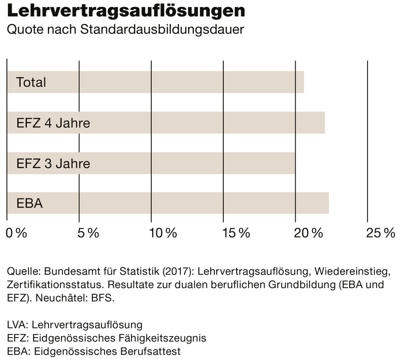 Derzeit werden 21 % der Lehrverträge aufgelöst, wobei sich die Zahlen nach Branche stark unterscheiden (vgl. Grafik). Die überwiegende Mehrheit der betroffenen Jugendlichen steigt jedoch zeitnah wieder in eine berufliche Grundbildung ein. Hinter einem vermeintlichen Abbruch der Ausbildung verbirgt sich also in aller Regel ein Wechsel des Betriebs oder des Lehrberufs. Im Vergleich dazu sind es gemäss Bildungsbericht 2018 bei jungen Erwachsenen in universitären Bildungsgängen 25%, die ihr Studienfach wechseln oder ihr Studium ganz aufgeben. Überraschenderweise liegt die Anzahl der Studienfachwechsel und -abbrüche an den Universitäten damit etwas höher als die Anzahl der Lehrvertragsauflösungen.