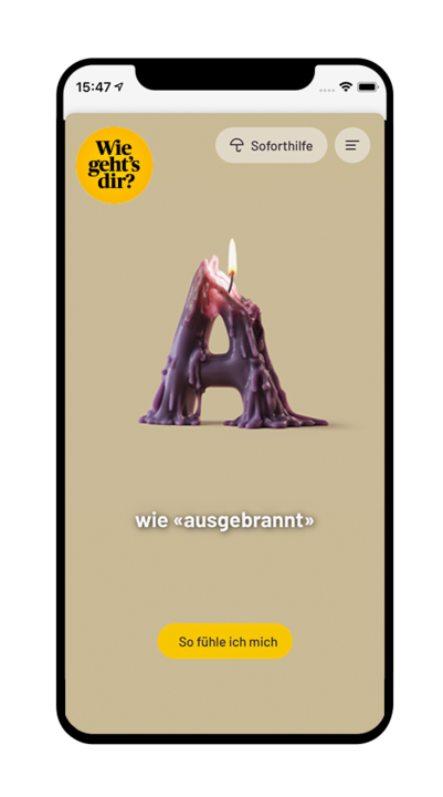 Die «Wie geht’s dir?»-App hilft, die psychische Gesundheit zu stärken. Man lernt, die ganze Bandbreite von Gefühlen bewusster wahrzunehmen, sie zu dokumentieren und mittels gezielter Massnahmen besser mit ihnen umzugehen – von A wie «AUSGEBRANNT» bis Z wie «ZUFRIEDEN».