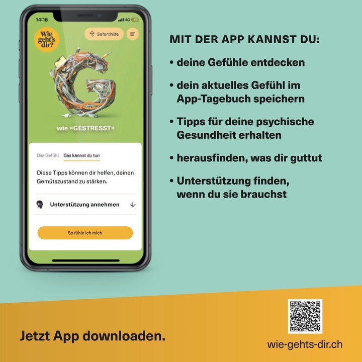 Die «Wie geht’s dir?»-App hilft, die psychische Gesundheit zu stärken. Man lernt, die ganze Bandbreite der Gefühle bewusster wahrzunehmen, sie zu dokumentieren und mittels gezielter Massnahmen besser mit ihnen umzugehen – von A wie «AUSGEBRANNT» bis Z wie «ZUFRIEDEN».